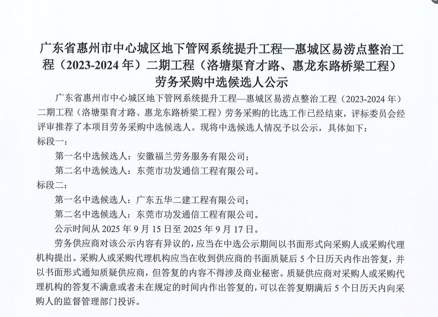 廣東省惠州市中心城區(qū)地下管網系統(tǒng)提升工程-內街小巷排水管網病害修復及錯混接改造項目一期施工勞務采購(第二次)中選候選人公示……